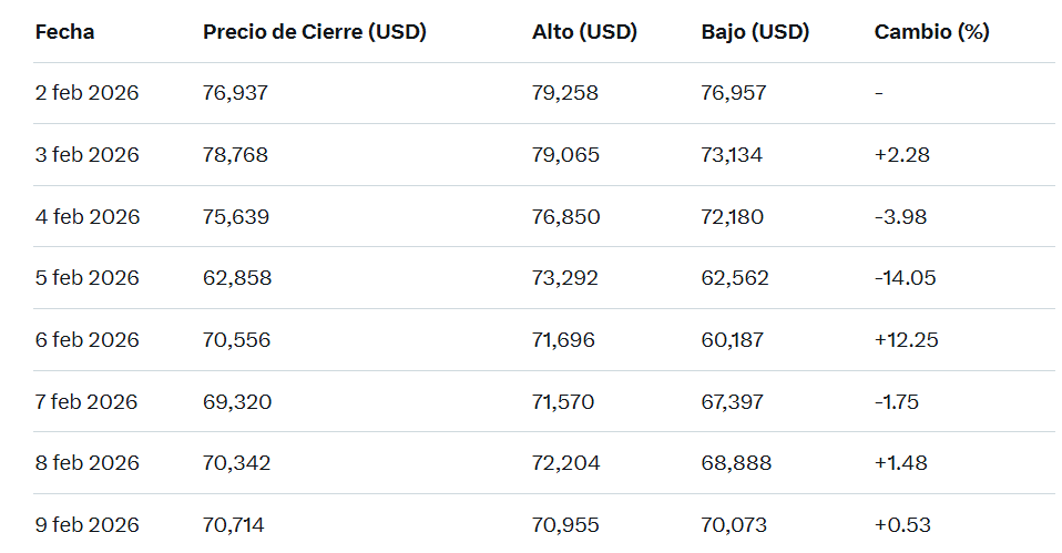 La semana comenzó con optimismo, alcanzando un pico histórico de 73.172 USD el 5 de febrero, según Statista, antes de un derrumbe que lo llevó a tocar los 60.000 USD el día siguiente. Este movimiento representó una pérdida de más del 14% en un solo día, atribuida en parte a liquidaciones masivas en posiciones apalancadas y un contagio desde mercados bursátiles tradicionales, donde índices como el S&P 500 y el Nasdaq también sufrieron retrocesos. Sin embargo, hacia el final de la semana, el BTC mostró signos de estabilización alrededor de los 70.000 USD, aunque la volatilidad persiste con volúmenes de trading que superaron los 100.000 millones de dólares diarios en los momentos pico.